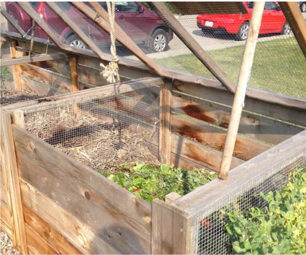 The garden has a 3 bin composter for plant material waste. It does not get hot enough to fully cure, and so cannot handle the same waste as residential backyard composters or the city compost program. Its main function is to reduce our garden waste that would otherwise go to the landfill.
