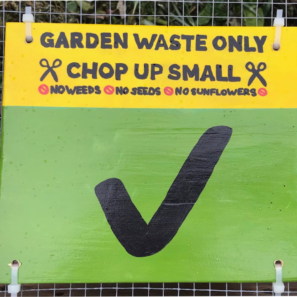 Only add garden waste to the green checkmark bin. The other bins are for finishing and storing compost.