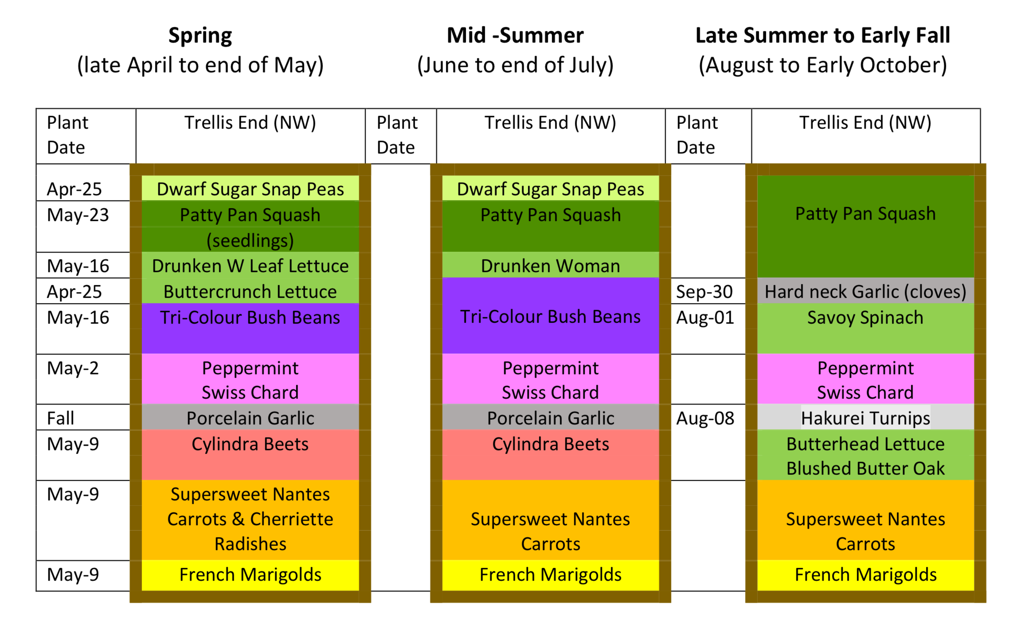 The following is a sample succession plan that alternates cool and warm season crops to maximize the short growing season in Calgary. Often poor growing conditions such as cold springs, summer heatwaves, or hail can cause plants to germinate and grow slower than expected and will require succession plans to be flexible!
